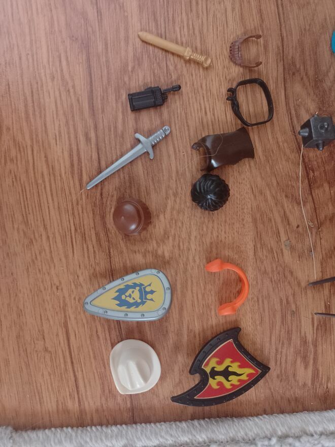 -Klocki: Brązowe włosy, kapelusz, czarne włosy, złoty miecz, tarcza z nadrukiem płomienia, 2 czarne miecze, 2 krótkofalówki, słuchawki, tarcza z nadrukiem lwa, miecz srebrny, antena, pas cena: 30 zł